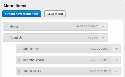 3. To change the structure of your menu you can simply click the menu item, on the far left side, and drag. If you change the vertical position of a menu item then this will change the order it appears in the menu. If you drag menu items to the right, so they are indented, this will make the menu item a sub menu. For example, in the screenshot above the Our History menu item is a sub menu of the About Us menu item.